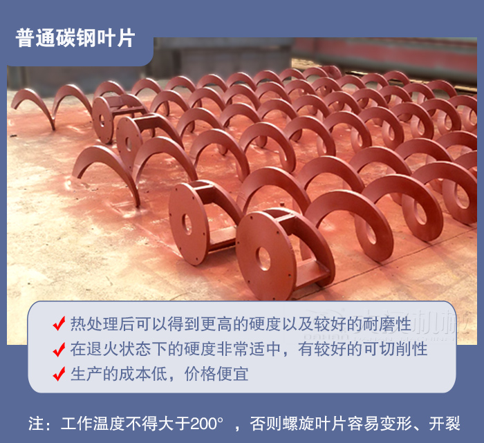 螺旋輸送(sòng)機(jī)應用廣泛,常用於物料的輸送,塊(kuài)狀、顆(kē)粒狀、粉狀等(děng)物料,或者一些高溫、腐(fǔ)蝕物料,代替了人工的搬運,效率更高。常見的螺旋葉片有普通碳鋼葉片(piàn),高錳(měng)鋼葉片以及不鏽鋼葉片。
