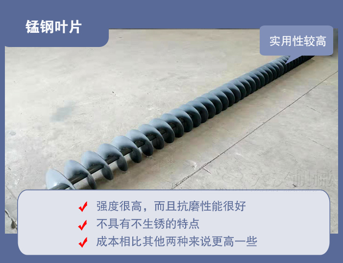 錳鋼螺旋輸送機葉片的強度很(hěn)高,而(ér)且抗磨性能很好,主要是由於錳鋼的錳元素,而錳鋼(gāng)不具有(yǒu)不生鏽的特點,與錳鋼相比,不(bú)鏽鋼的抗氧化性能以及耐腐蝕性能就很好了(le),但是強度沒有錳鋼好。