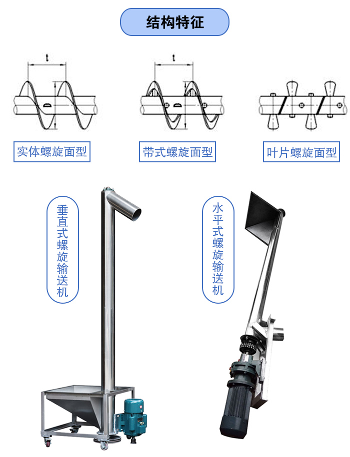 (3)螺旋輸送機的類型有水平固定式螺旋輸送機、垂直(zhí)式螺旋輸送(sòng)機。水平固定式螺旋(xuán)輸送機是常用的一種型(xíng)號。垂直式螺旋輸送機用於(yú)短(duǎn)距離提升物料,輸送(sòng)高(gāo)度(dù)一般不大(dà)於8m,螺旋葉片為實體(tǐ)麵型,它(tā)必須有水(shuǐ)平螺旋(xuán)喂料,以保(bǎo)證必要的進料壓力。