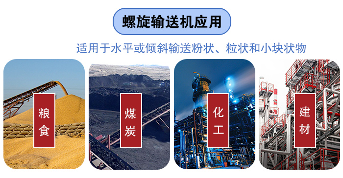 螺旋輸送機廣泛應(yīng)用於各行業,如建材、化工、工業、煤礦炭、糧(liáng)食等行業,適用於水平或傾斜輸送粉狀、粒狀和小塊狀物料(liào),如粉煤灰、石灰、水泥、飼料、肥料、砂漿、糧食、麵粉等,物(wù)料溫小於200℃。