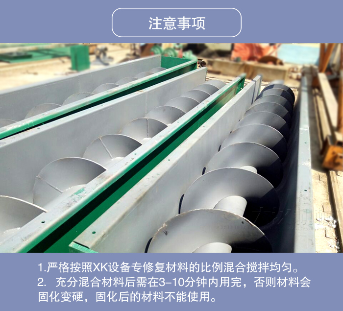 1.嚴格按照(zhào)XK設備專修複材料的比例混合攪拌均勻。攪拌不均勻會出現局部不耐磨(mó)情(qíng)況。