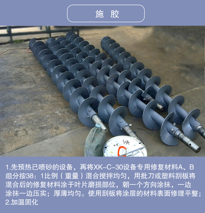 1.先預熱已噴砂的(de)設備,再將XK-C-30設備專用修複材料A、B組分按38:1比例(重量)混合攪拌均勻,用批(pī)刀或塑料刮板將混合後的修複材料塗(tú)於葉片磨損部位,朝一(yī)個方向塗抹,一邊塗抹一(yī)邊壓實;厚(hòu)薄均勻。使用刮板將塗層的材料表麵修理平整;