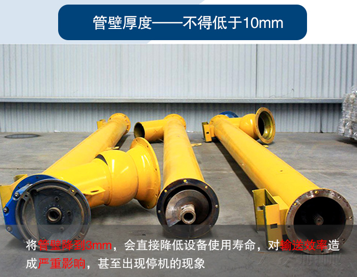 一般情況下,管式螺旋輸送機管(guǎn)壁厚度要求不低(dī)於10mm,有些廠家為了在其中賺取更多利益,將管壁降到了3mm,會直接(jiē)降低設備(bèi)使用壽命,對輸送效率造成(chéng)嚴重影響,甚至出現停機的現象。