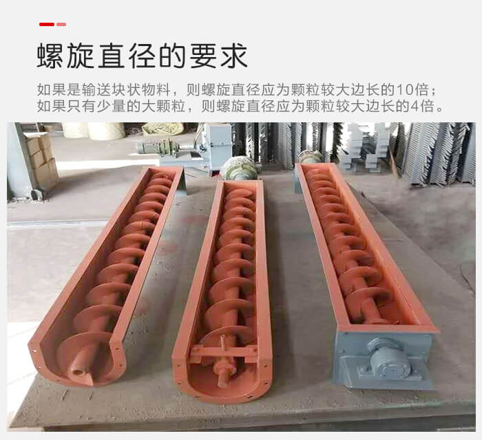 5.螺旋直徑對於絞龍輸送機的螺旋直徑來講,應滿足的要求有(yǒu):如果(guǒ)是輸送塊狀物料,則螺旋直(zhí)徑應為顆粒較大邊長的10倍;如果(guǒ)隻有少量的大顆粒,則螺旋直徑應為顆粒較(jiào)大邊長的4倍。