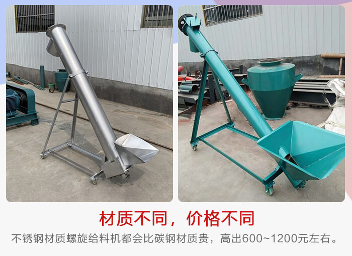 螺旋給料機(jī)可以(yǐ)分為碳鋼和(hé)不鏽鋼材質兩種,由於(yú)這兩者材質成本有差異,碳鋼螺旋給料機適合普通物(wù)料輸送(sòng),不鏽鋼螺旋給料機主要用於輸送機一些腐蝕性、高(gāo)溫物料,也用於食品、醫藥等對輸(shū)送環境有衛生標準的行業,所以不鏽鋼(gāng)材質螺旋給料機都會(huì)比碳鋼材質貴,一般(bān)會高出600~1200元左(zuǒ)右。