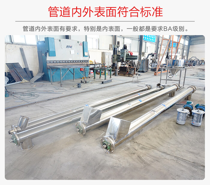 除了材質以外,還對管道內外表麵有要求,特別是內表麵,一般都是要求(qiú)BA級別,管道表麵(miàn)的光潔標準(zhǔn)主要有AP、BA、EP三種,EP是電化學(xué)級別(bié)比較(jiào)貴!所以不鏽鋼螺旋輸送機使用到食品(pǐn)行業是可以的(de)。