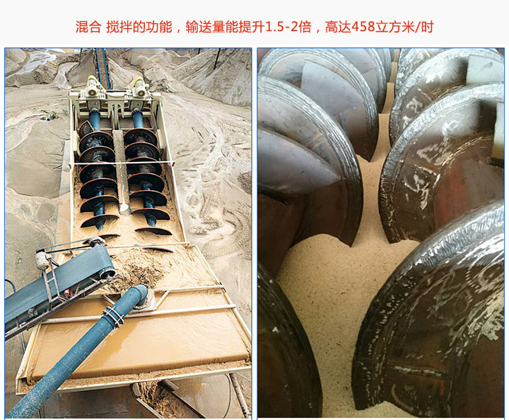雙軸螺旋輸送機是兩片螺旋葉片組合而成,兩根(gēn)螺旋軸相反方向旋轉,具備混合、攪拌的功(gōng)能,輸送量能提升1.5-2倍,高達458立(lì)方米/時。