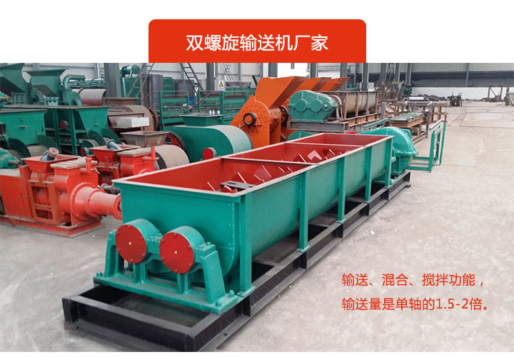 雙軸螺旋輸送機是利用兩根螺旋軸(一正一反)輸送物料,同時具備輸送、混合、攪拌功能,不易堵料;輸送量是單軸的(de)1.5-2倍。
