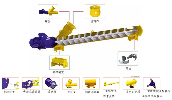 水泥螺旋(xuán)輸送機由進料口(kǒu),出料口,電機,減速機,螺旋葉片,螺旋管體,等(děng)組成,附帶電纜線(xiàn),連接帆布套,吊掛鋼絲繩等配件。