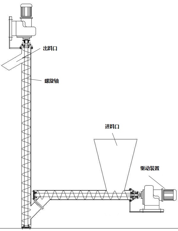 立式螺旋輸送機由水平進料螺旋和垂直喂料螺旋組成。