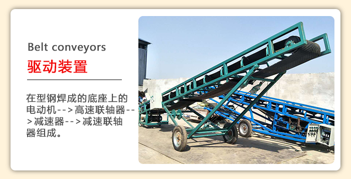 1.驅動(dòng)部分:係由裝(zhuāng)置在型鋼焊成的底座上的電動機-->高速聯軸器-->減速器-->減(jiǎn)速聯軸(zhóu)器組成。根據布置要求:驅動裝置設有左裝和右裝(zhuāng)兩種,另(lìng)外本公司配有功率1.5KW到13KW,速度0.80、1.0、1.25的(de)油冷式電動滾筒。
