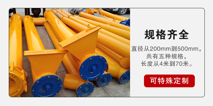 管型螺旋輸送機是利用螺旋旋轉而推移物料(liào)的連續輸送設備,適用輸送麵粉、穀(gǔ)類、水泥、化肥、灰渣、沙子、石子、煤粉、小塊煤等物料。由於機體內有效流通麵積小,螺旋輸送機(jī)不宜輸磅易變質的、粘性太大、易結塊(kuài)的(de)物(wù)料。
