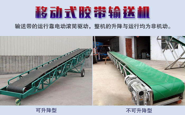 DY型移(yí)動式膠帶輸送機分為可升降型及不可升降(jiàng)型兩大類,輸送(sòng)帶的運行靠電動滾筒驅動,整機的升降與運行均為非機動。