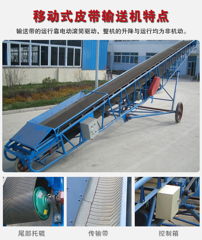 移動式皮帶輸送機適用於散狀物料或成件物品的短途運(yùn)輸(shū)和裝卸工作。采用鋼管結構,輕巧美觀,機(jī)動性好。轉動(dòng)裝置為電動滾筒,並配有充氣輪胎(tāi)和鋼輪(lún)兩種行走輪。機長10米以上且傾角可以調整。