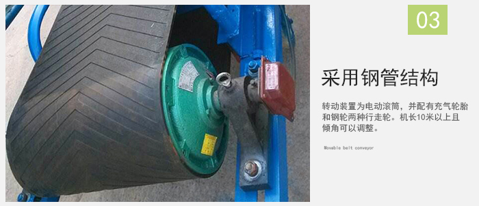 采用鋼管結構,輕巧美觀,機(jī)動性好。轉動裝置為電動滾筒,並配有充氣輪胎和鋼輪兩種行走輪。機長10米以上且(qiě)傾角可(kě)以調整。