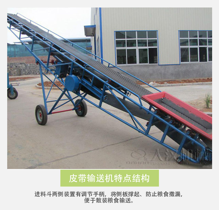在可移動式皮帶輸送機機架兩旁裝(zhuāng)有旁導管,防止糧包在輸送時掉包,並在進料鬥兩側(cè)裝置有調(diào)節手柄,將側板撐(chēng)起、防止糧食撒漏,便於散裝糧食輸送。大、小走輪均采用實心(xīn)膠輪(lún),防止壓碎糧食和倉庫地麵。
