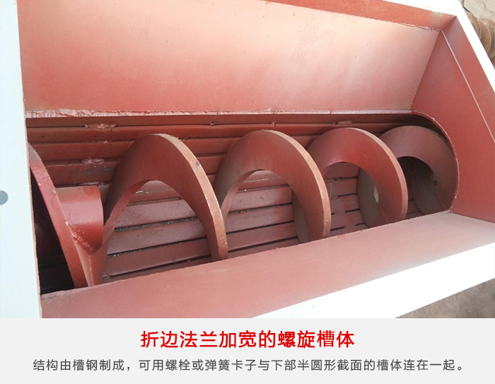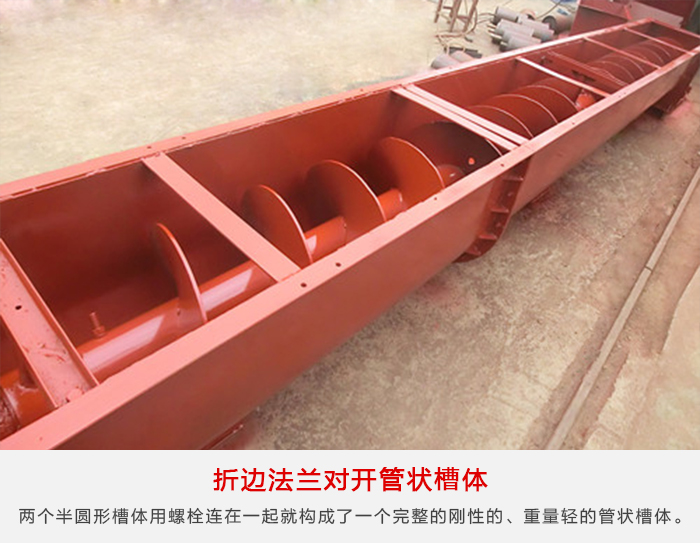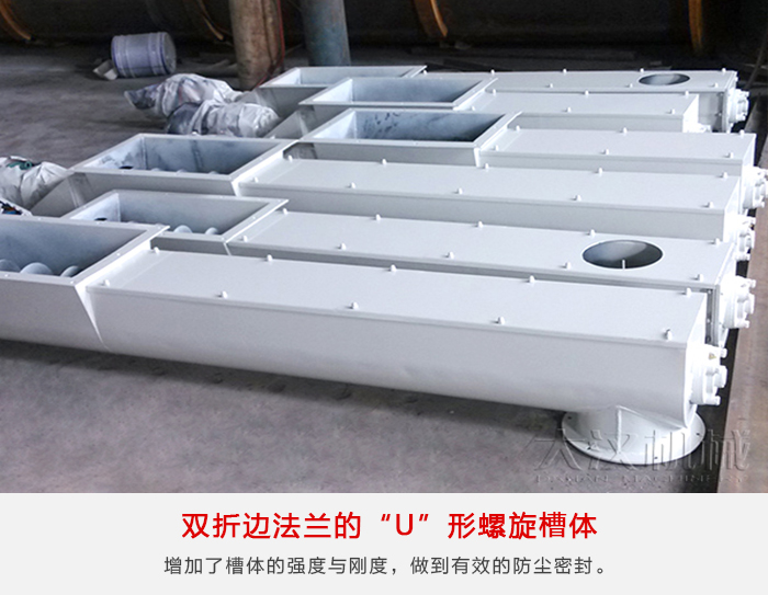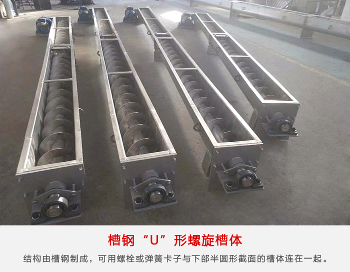 槽鋼“U”形螺旋槽體適(shì)用於輸送機支承間距要(yào)求長的場合。槽體的上邊由結構槽鋼製成,可用(yòng)螺栓或彈簧卡子與下部半(bàn)圓形(xíng)截麵的槽體連在一起。