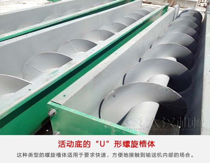 這種(zhǒng)類型的螺旋槽體適用於要求快速、方便地接觸到輸送機內部的場合(hé)。活動底的U形螺旋槽體由上部(bù)剛性的槽(cáo)鋼與(yǔ)下部半圓形截麵槽上體所構成,半圓形截麵槽體的一(yī)邊為鉸(jiǎo)接麵,另一邊則(zé)采用彈簧卡子夾緊(jǐn)或(huò)其他(tā)形式能快速打開的連接裝置。