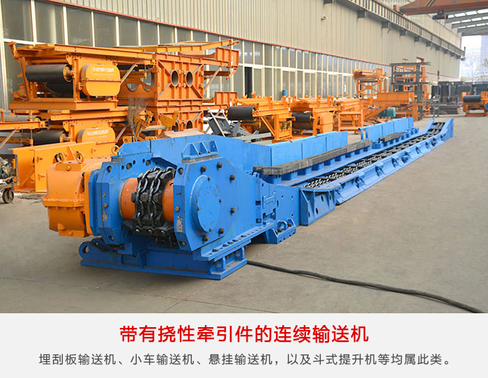 帶式輸送機、鏈(liàn)板輸送機、刮板輸送機、埋刮板輸送機、小車輸送機、懸掛輸(shū)送機,以及鬥式(shì)提升機等均屬(shǔ)此類(lèi)。其工作特點是把(bǎ)物(wù)品置於承載件上,由撓性牽引件搬(bān)運承(chéng)載件沿著固(gù)定的線路運動,靠(kào)物品和承載件的摩擦力(lì)使物(wù)品與牽引件在工作區段(duàn)上一起移動。
