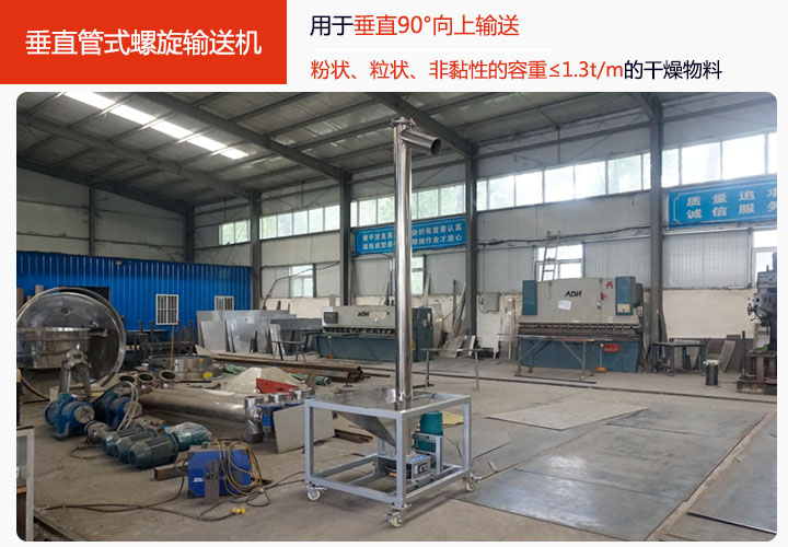 垂直管式螺旋(xuán)輸送(sòng)機適合(hé)垂直90°向上輸送物料,能(néng)輸送粉狀、粒狀、非黏性的容重≤1.3t/m的幹燥物料。垂直管式螺旋輸送機的輸送(sòng)過程依(yī)靠(kào)的是物料與機殼之間的摩擦力進行物料的輸送,進料口到出料口(kǒu)之間(jiān)的距離從2.5米起到(dào)15米止,0.5米(mǐ)為一檔,用戶可根據需要選用(yòng),大漢(hàn)垂直管式螺旋(xuán)輸送機材質分為兩種:碳鋼與不鏽(xiù)鋼,碳鋼的(de)比較適用於一般的物料的提升,不鏽鋼材質的主要(yào)用於(yú)食品行業與化(huà)工行業的使用。