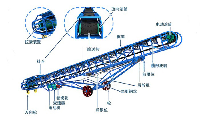 帶式輸送(sòng)機主要由輸送帶、驅動(dòng)裝置、滾筒、托輥、張(zhāng)緊裝置、清掃裝置等組成(chéng)。輸送帶是輸送機的主體部件,用於承載物料並傳遞動力。驅動裝置(zhì)通常包括電動機(jī)、減速器和聯軸器,提供動力(lì)驅動輸送帶運行。滾筒用(yòng)於支撐和傳遞輸送帶的運(yùn)動力,托輥支撐輸送帶並減少摩(mó)擦。張緊裝(zhuāng)置(zhì)用於調(diào)整輸(shū)送(sòng)帶的張緊度,保持適當的張力(lì)。清掃(sǎo)裝置用於清(qīng)除輸送帶上的雜物,保持輸送帶清潔。這些組成部分協同工作,使(shǐ)帶(dài)式輸送(sòng)機(jī)能夠(gòu)高效、穩定地完成物料的輸送任務。
